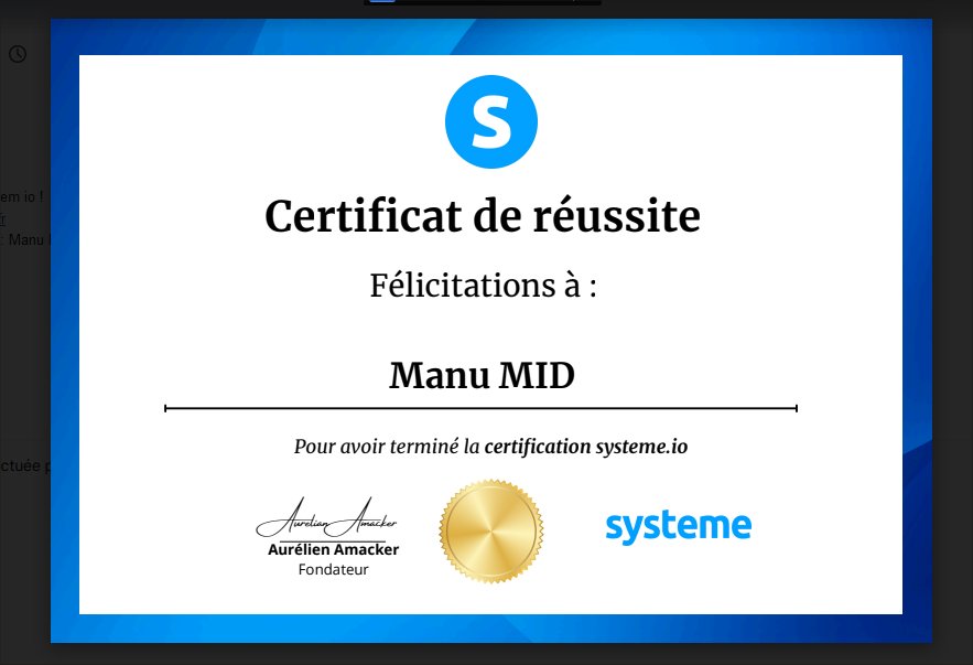 La certification Systeme..io te permet de maîtriser la création de tunnels, l’automatisation, la gestion des produits digitaux et l’organisation d’un système complet de vente.